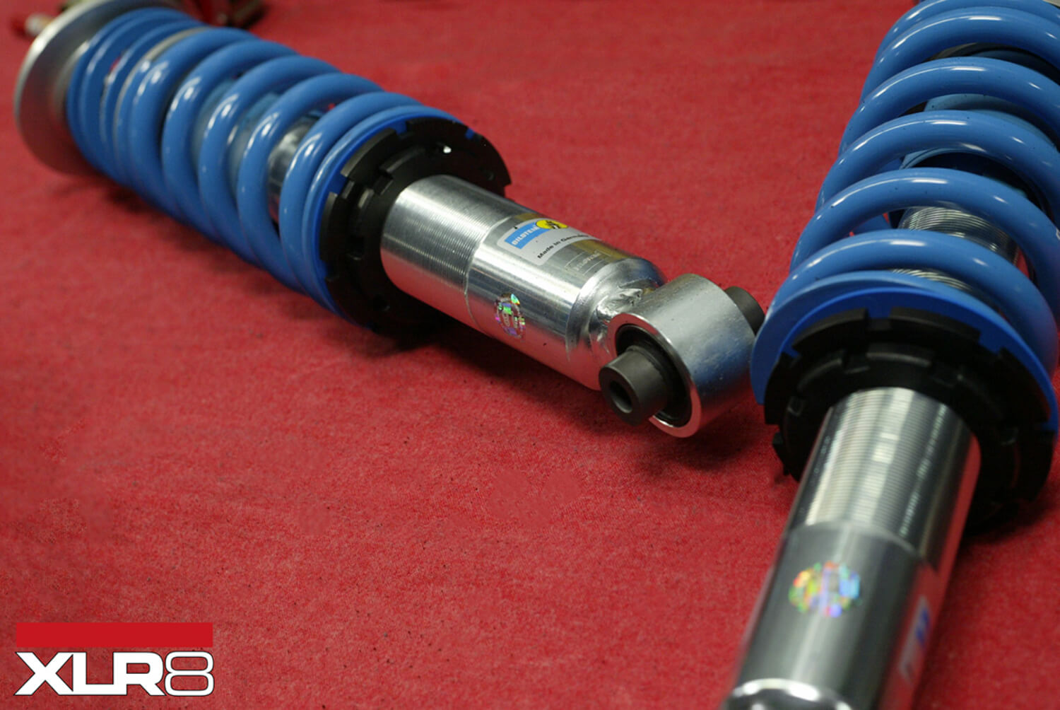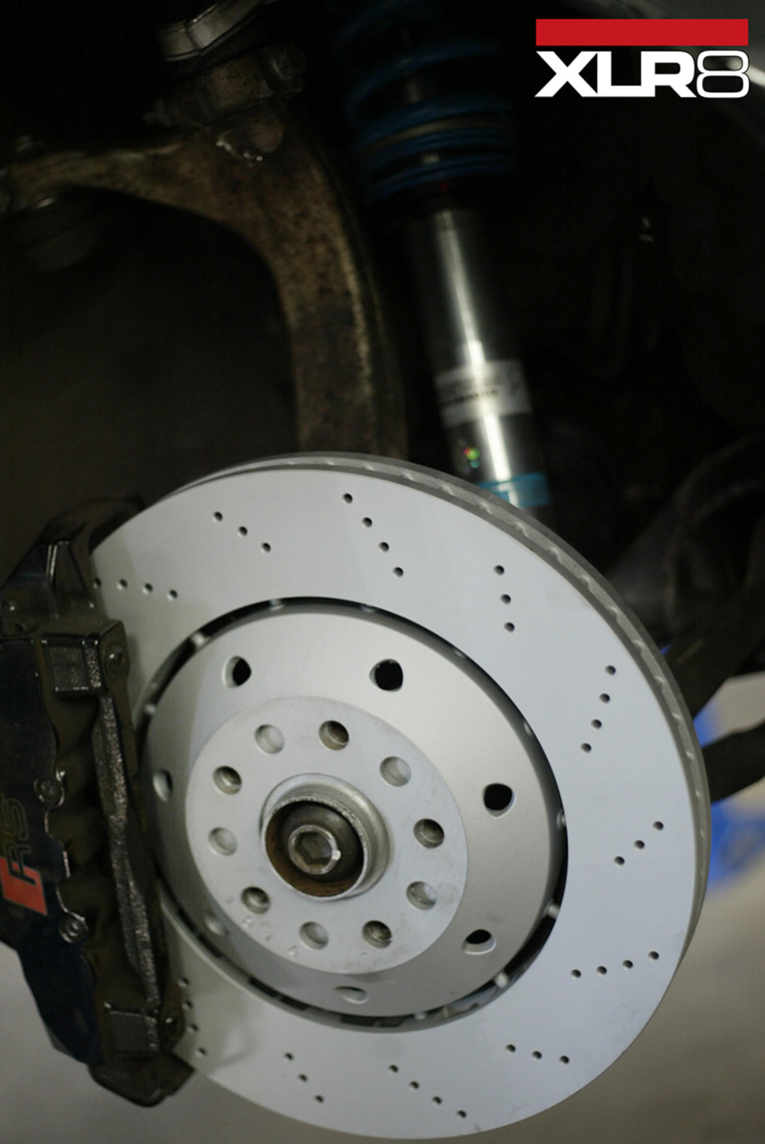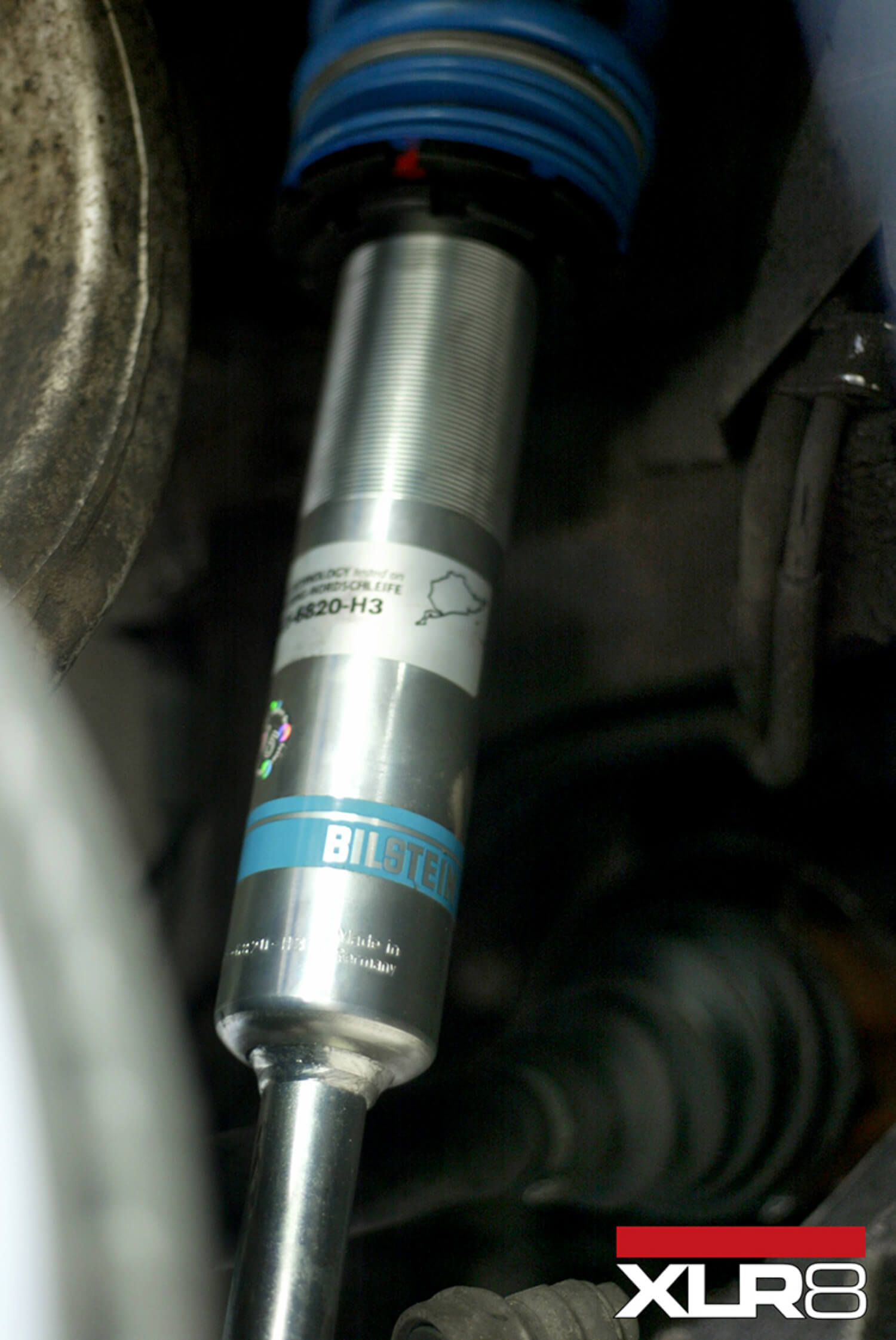 Remember when we mentioned that this car was driven hard? We weren’t kidding! All the upper shock mounting hats had been beaten up and actually were damaged to the fact that the strut mount was disintegrated and the shock itself was pushing it through the aluminum mounting hat. This in turn had ruined the upper spring locators on the coilovers. Did that matter much at this point? Not really, the coilovers on the car were completely blown, leaking fluid all over the place out of the external reservoirs, they were in definite need of replacement anyways. So a fresh set of Bilstein PSS10 coilovers were ordered along with all new mounting accessories, hardware and bushings. This car rides great now with its all new suspension setup. Lastly, the braking system needed to be addressed. The rotors were so far worn that they started cracking and ruining the recently stuffed pads. We deemed it was rather unsafe to be driving a car of this caliber and tuned power level to skip this for next service.