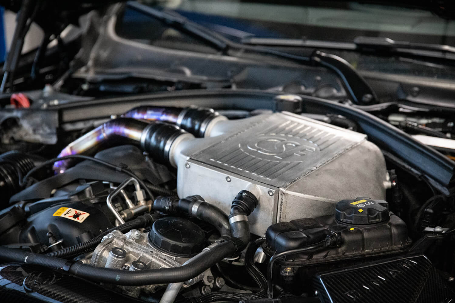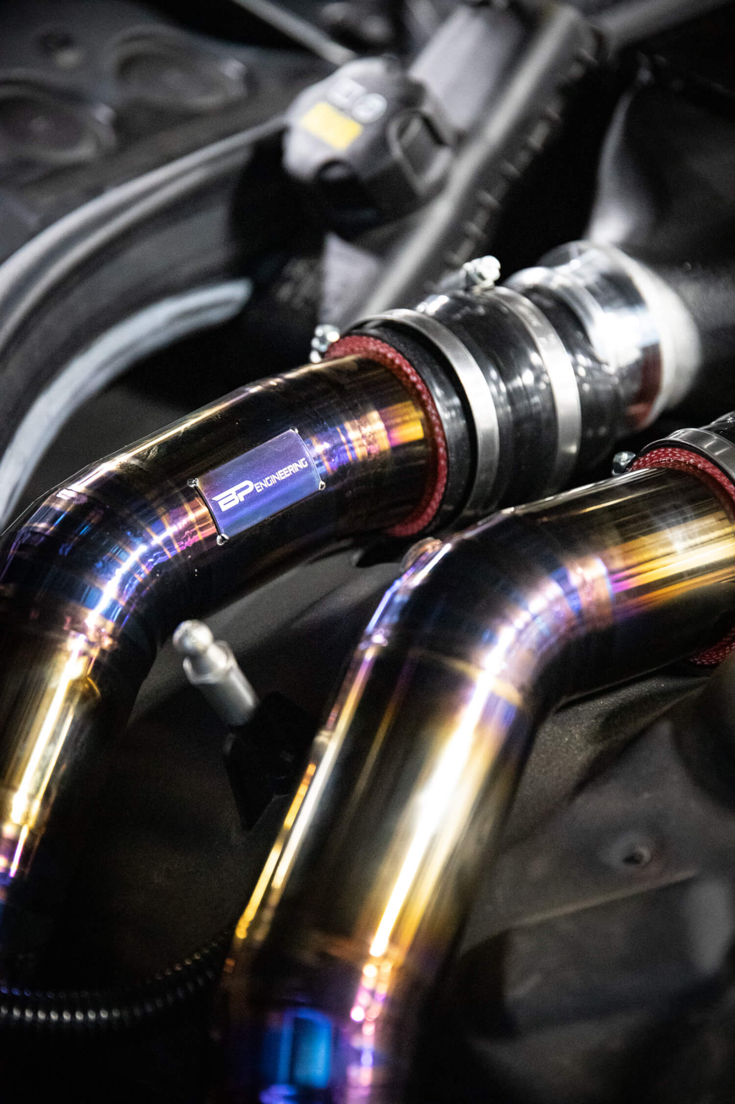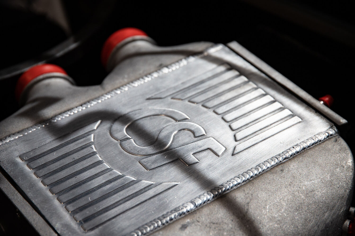 Next, we got a CSF Water to Air Intercooler. Mated to this is BP Engineering titanium piping. Do you like pie cuts? We sure do.
