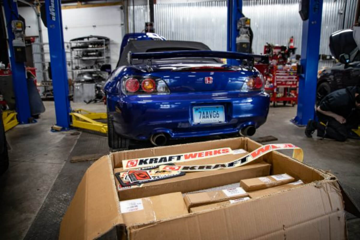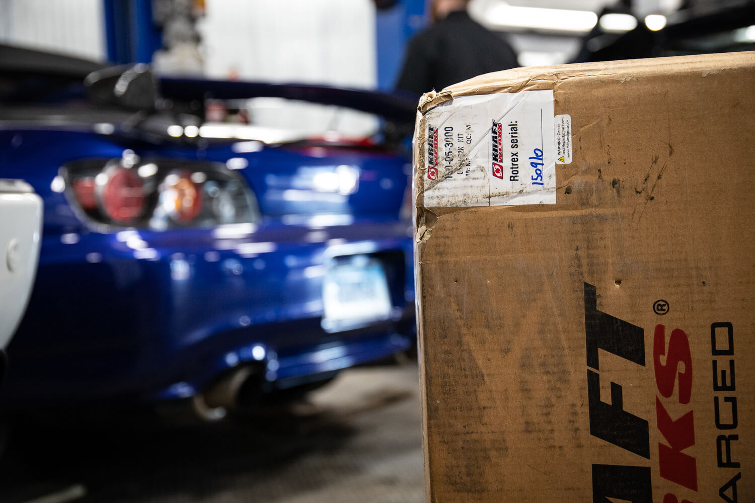 We installed this kit on his tastefully modified S2000 rolling on Volk Racing CE28s filled with plenty of carbon fiber goodies, wide fenders, and more! The Kraftwerks kit comes with everything you need to get the car up and running from Rotrex unit to the intercooler, right down to fueling and tuning! We opened the box and got to install: