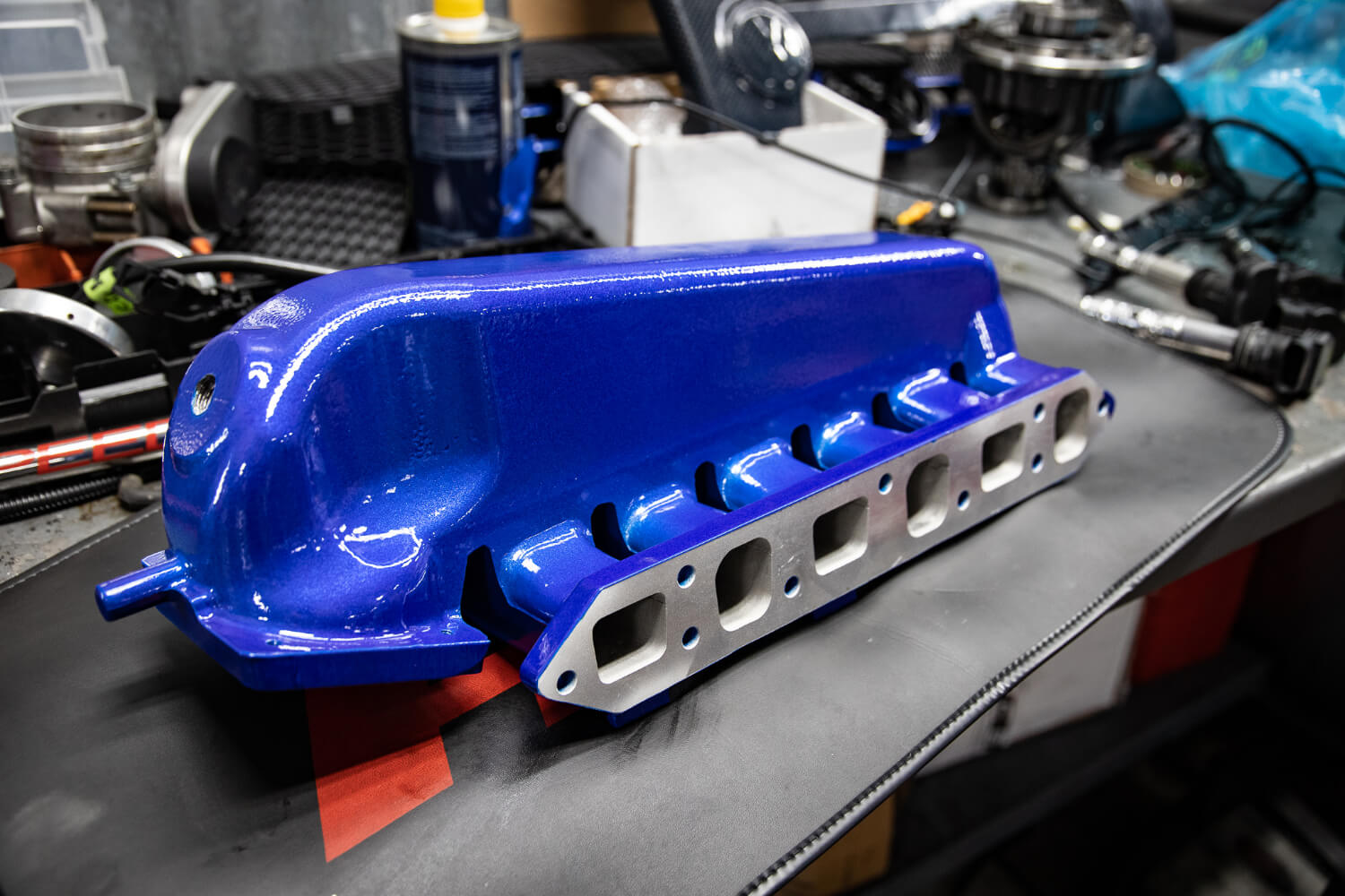 From there, we turned our attention to the engine bay. Siemens 630cc injectors were installed with a United Motorsports R32 custom tune and new spark plugs to up the power a tad. We modified a CTS Short Runner Intake to fit vacuum ports and also had the manifold powdercoated to match the rest of the car. Next, we took care of some failing strut mounts by replacing them with new PowerFlex bushings. Lastly, a Haldex controller and P3 gauge were the final touches to getting this R32 tidied up for Aaron. As you can see, he found himself a great candidate with a big brake kit pulled from a Porsche, coilovers, and lightweight wheels. Check out our gallery below.